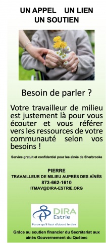 DIRA-Estrie offre, depuis octobre 2018, un service gratuit et confidentiel de travail de milieu pour les aînés de 65 ans et plus des arrondissements du Mont Bellevue et de Fleurimont à Sherbrooke.